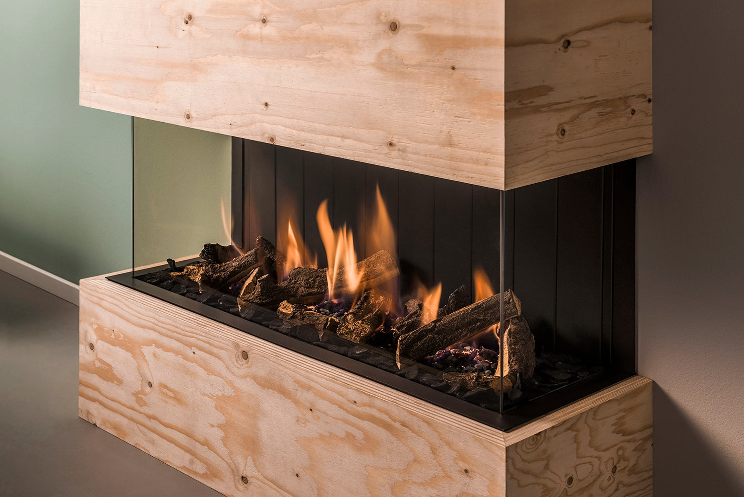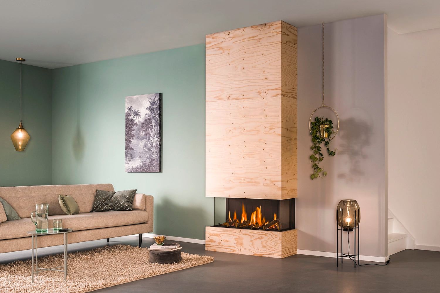 Versjonen som vises her er montert relativt lavt. Standardversjonen av denne peisen har en brennerbase av trekubber og innvendig kledning i lamell. Trimline 100-serien har også tunnel-, front- og hjørneversjon. I tillegg leveres den med Ecomax-fjernkontroll, og du kan velge å legge til WiFi-betjening med Trimline Fires-appen. Klikk her for å se alle tilpasningsmulighetene.