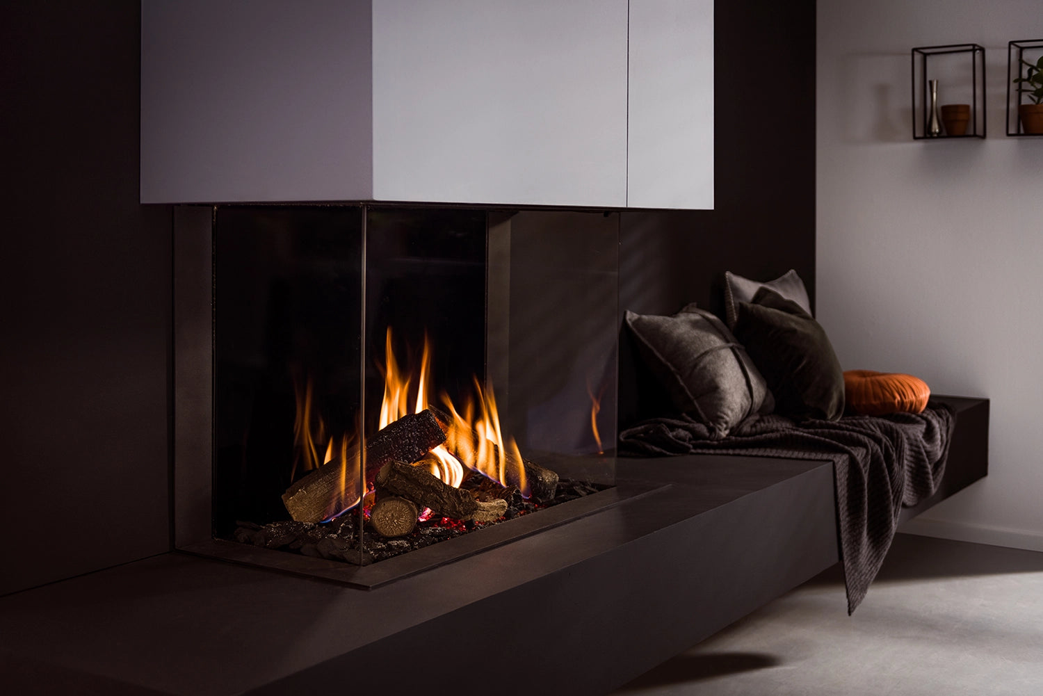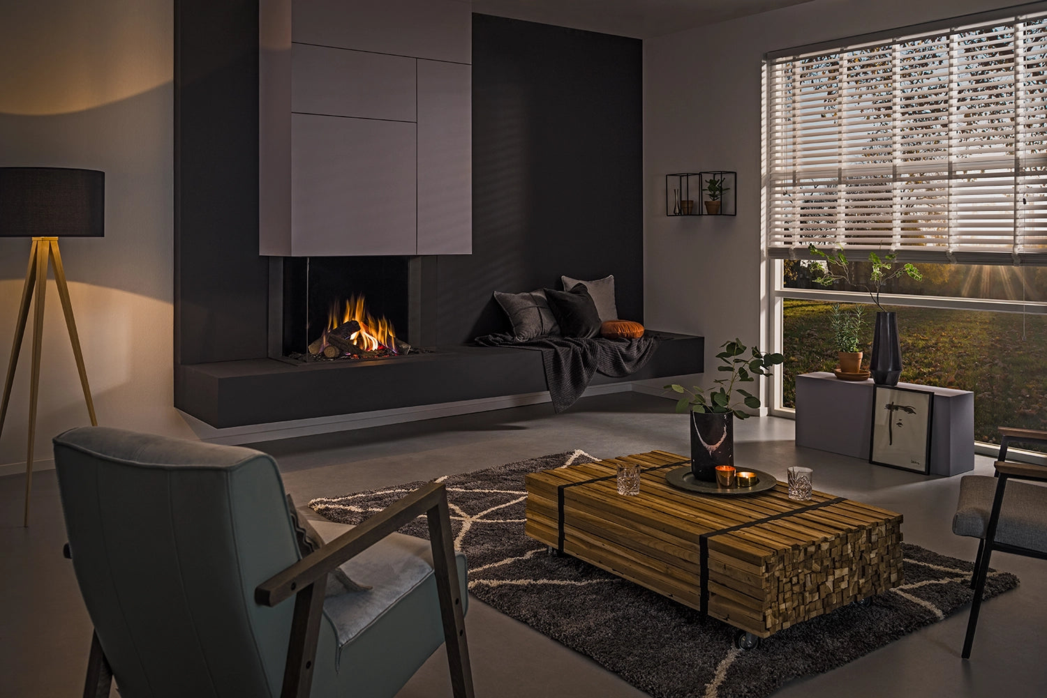 Versjonen som vises her har en innvendig kledning i svart glass. Trimline 83 Panorama har mange tilpasningsmuligheter, og resultatet blir utrolig stilig uansett hvilke valg du gjør. 83-serien kommer også som front- og hjørneversjon. Den leveres med Ecomax-fjernkontroll, og du kan velge å legge til WiFi-betjening med Trimline Fires-appen. Klikk her for å se alle tilpasningsmulighetene.