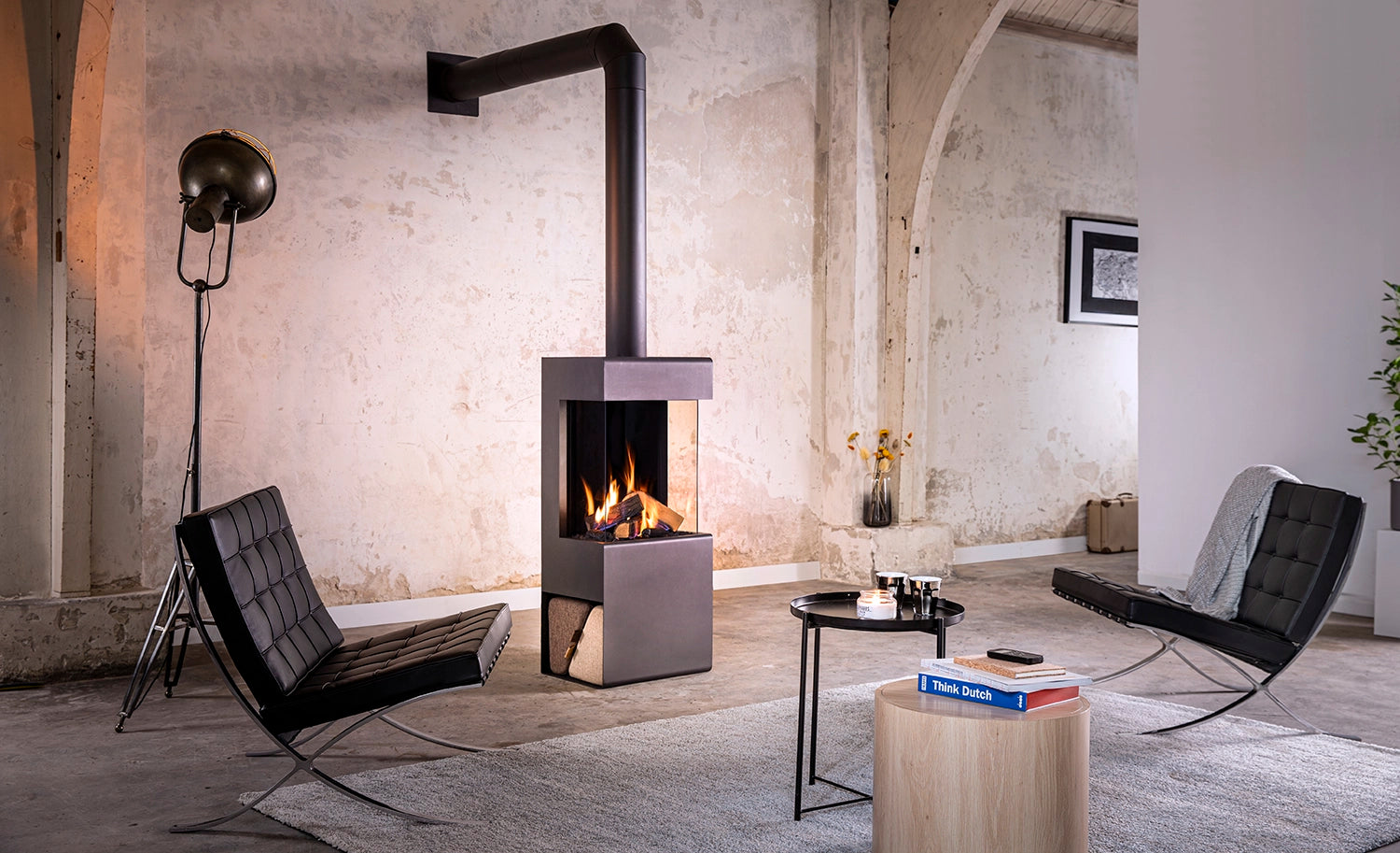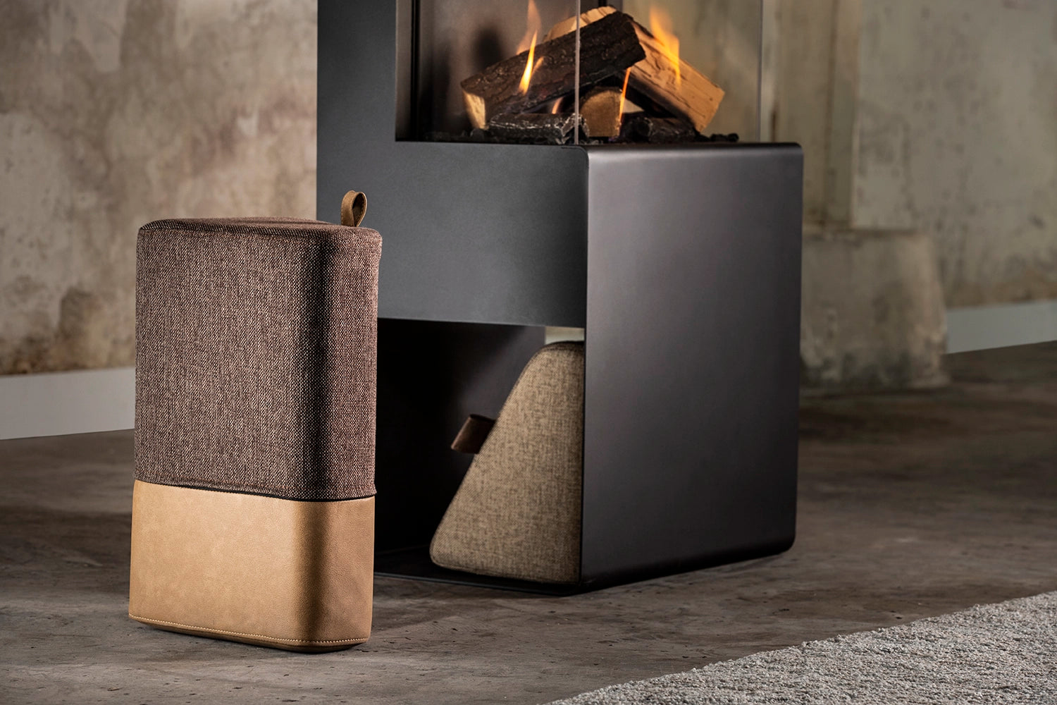 Du har muligheten til å ha plass til vedkubber i peissokkelen, men du kan også velge å bruke denne plassen til et unikt designelement. Vi har også designet noen flotte krakker som gir peisen det lille ekstra. Krakkenes trefargede og flammerøde design står perfekt til peisen.