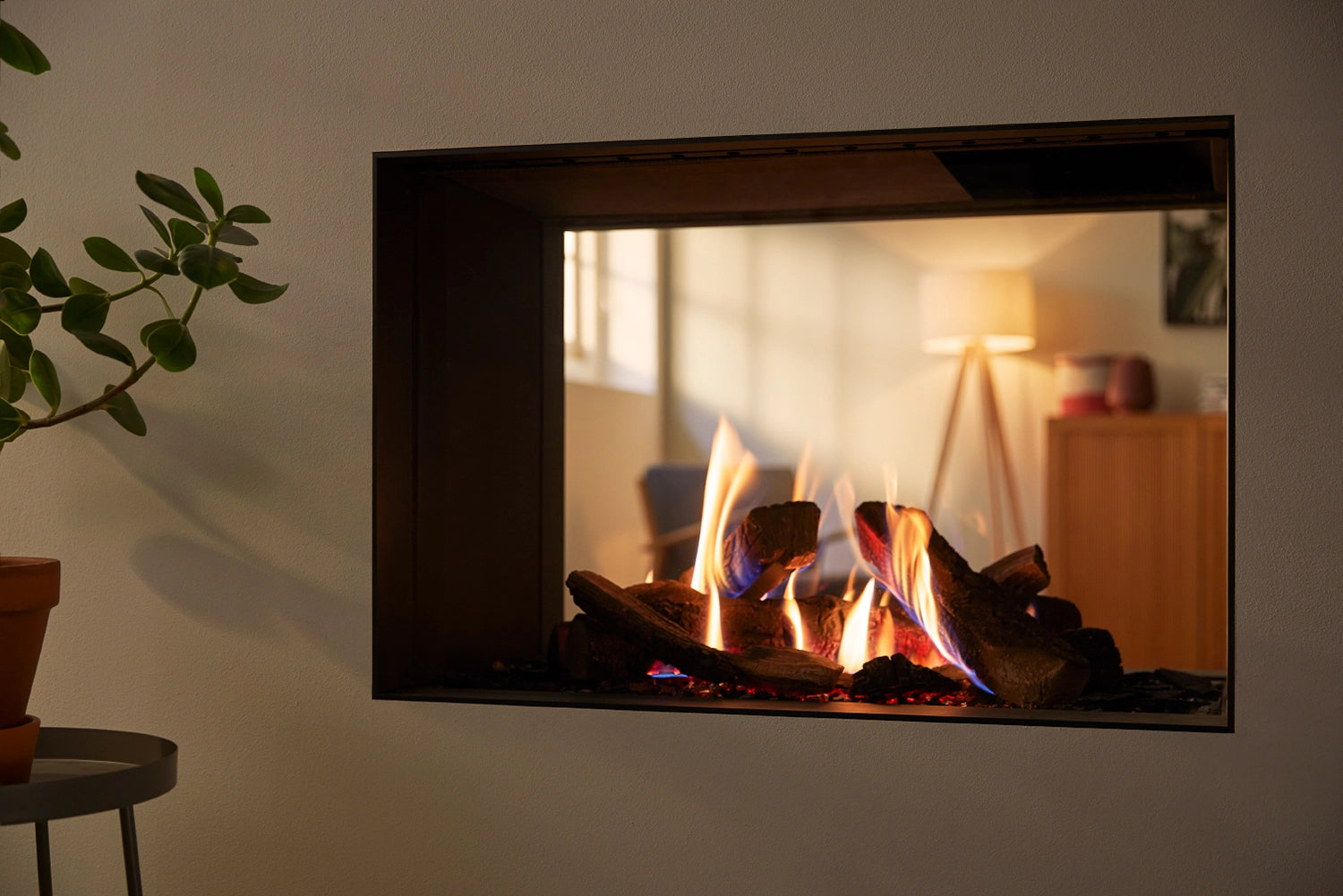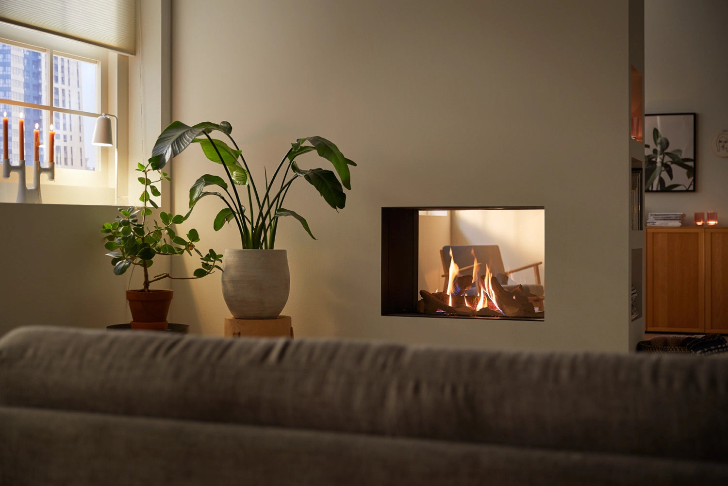 Standardversjonen av denne peisen har en brennerbase av trekubber og er utstyrt med dobbel brenner. Du kan også velge en integrert LED-base for å skape enda mer stemning. Tunnelpeisen Trimline 83 finnes også i romdelerversjon. I tillegg leveres den med Ecomax-fjernkontroll, og du kan velge å legge til WiFi-betjening med Trimline Fires-appen.